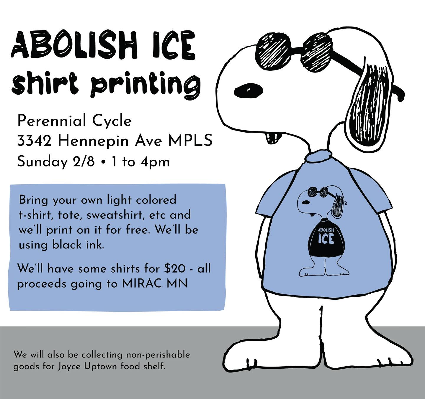 Bring your own light colored shirt (we are using black ink) and we will print on it for free and will accept donations for mirac mn.