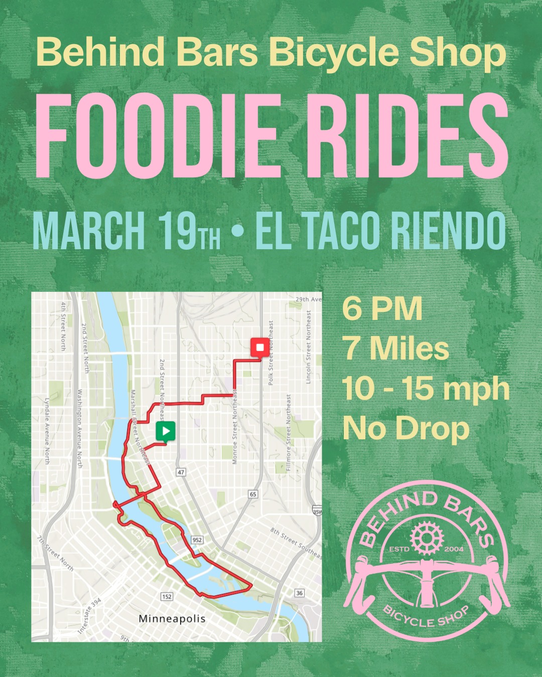 The final Foodie Ride of the winter is on Thursday, March 19th. For the route we're keeping it classic with a ride down to the Stone Arch Bridge and back up to Northeast. The ride ends at El Taco Riendo, a classic NE Mpls Mexican restaurant. The route is 7 miles of bike paths and neighborhood streets. This is a no-drop ride, meaning we will stay together as a group.