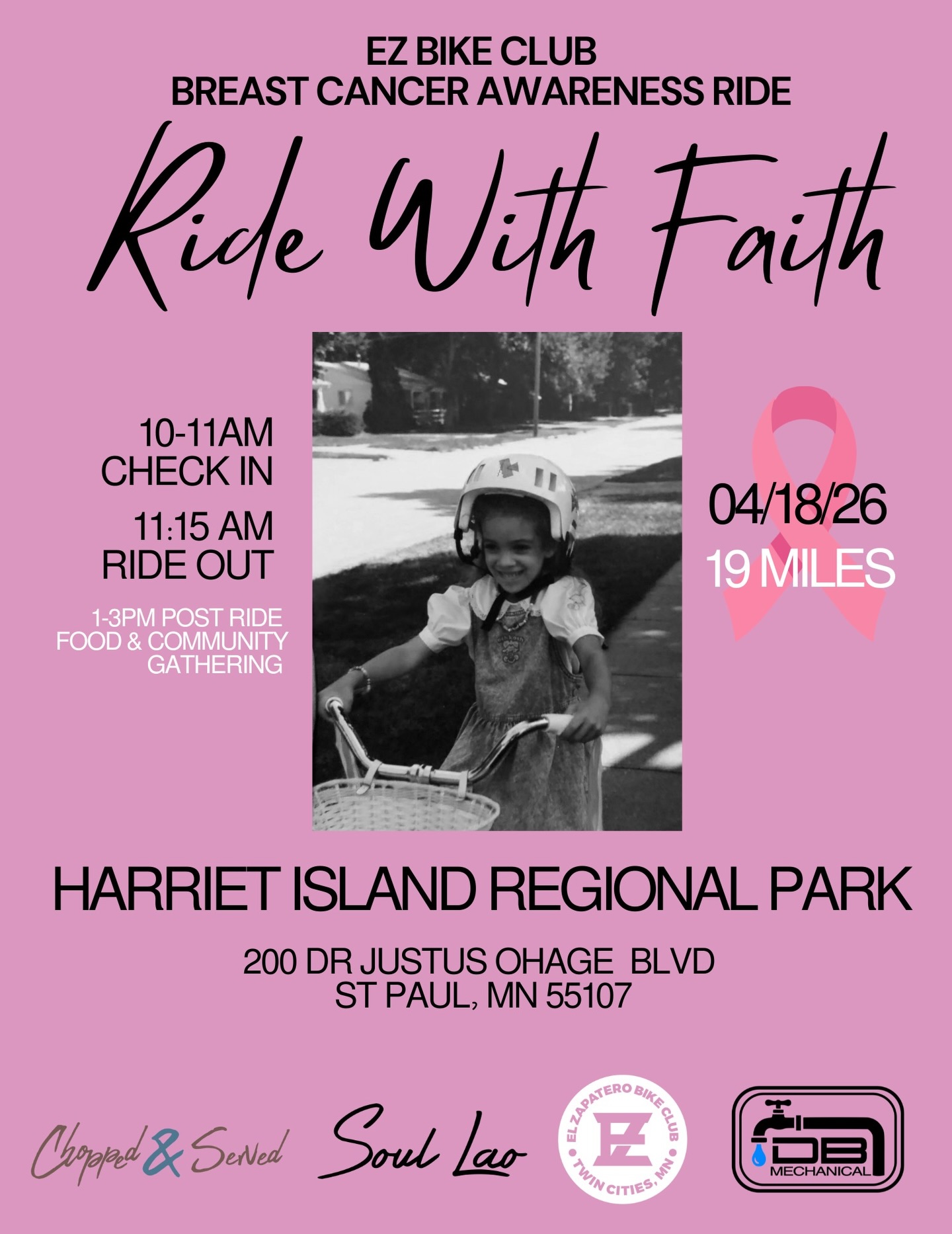 Join the EZ Bike Club community for a meaningful 19-mile breast cancer awareness ride in support of our girl @becauseyougottohavefaith. One of our cub members and board member, Faith was recently diagnosed with an aggressive form of breast cancer on March 2nd. Invasive Ductal Carcinoma / Estrogen Positive / Progesterone Positive / HER2+ She had surgery on March 24th and as she prepares to begin an intense treatment plan in the coming weeks, including 12 weeks of chemotherapy, 3 1/2 weeks of radiation, and a year of immunotherapy, we’re rallying around her with a 19 mile fundraising ride on April 18th to help support her. Faith is insured. However, out-of-pocket costs for breast cancer treatment in the USA are substantial. Faith has been a bright light and an important part of our EZ Bike Club family since she joined. Faith has spent her life’s work getting funding to those who need it and lifting up the community around her. Every individual and business who comes alongside us is so very appreciated. Much love to our incredible event sponsor @db.mechanical, our t-shirt sponsor @schorbahnfamilylaw, and to our food sponsors @choppednserved and @soullao. We appreciate you all for helping make this event so special! To become a ride sponsor, have questions, or other ideas, please email: EZ.Bikeclub@gmail.com. Thank you so much for considering supporting this meaningful ride. Link in bio to register. 🔗 Date: Saturday, April 18th, 2026 Location: Harriet Island Regional Park 200 Dr. Justus Ohage Blvd, Saint Paul, MN 55107 Time: 10AM-3PM With love and gratitude, The EZ Bike Club Community of Faith Michon Ross